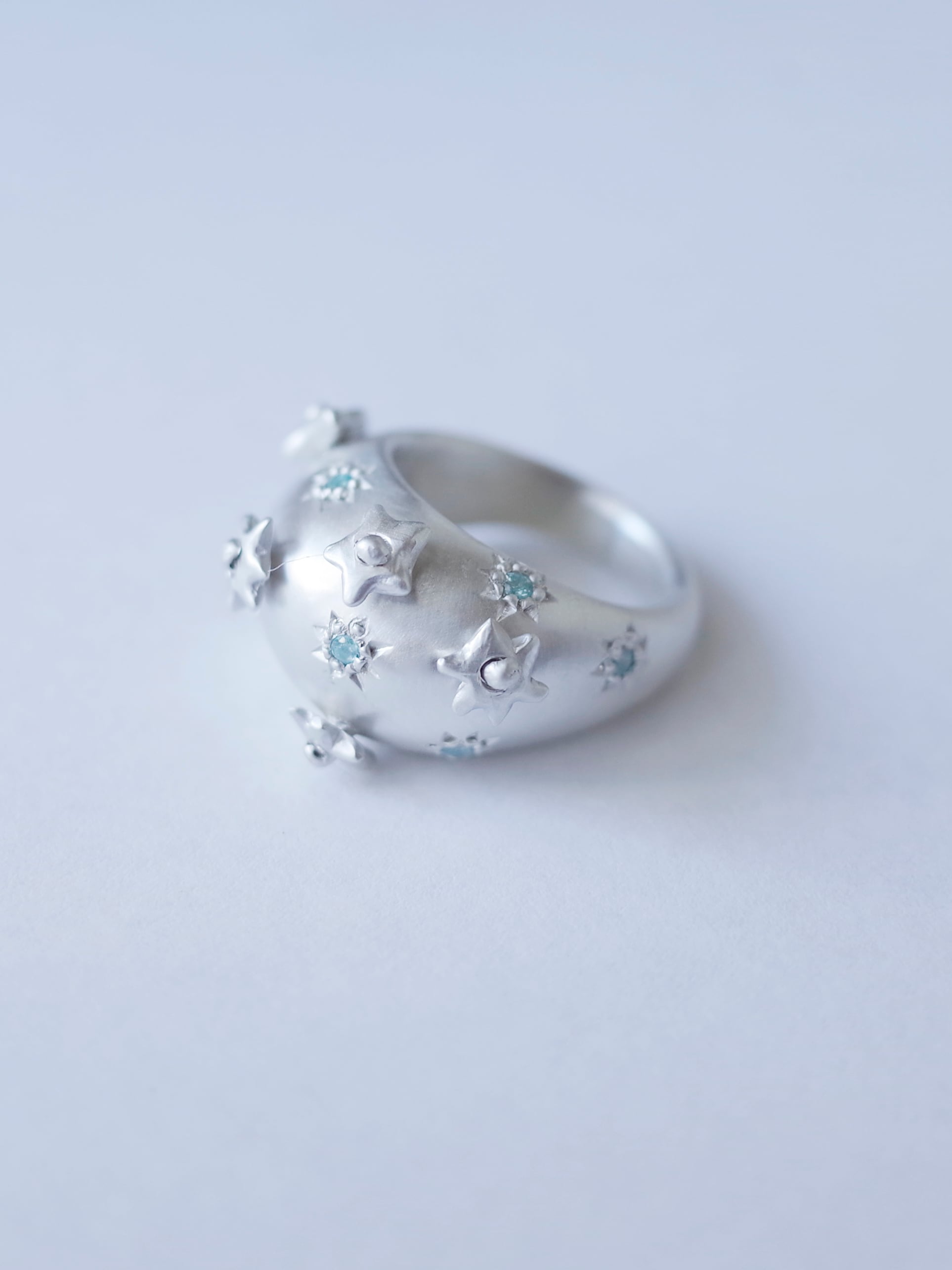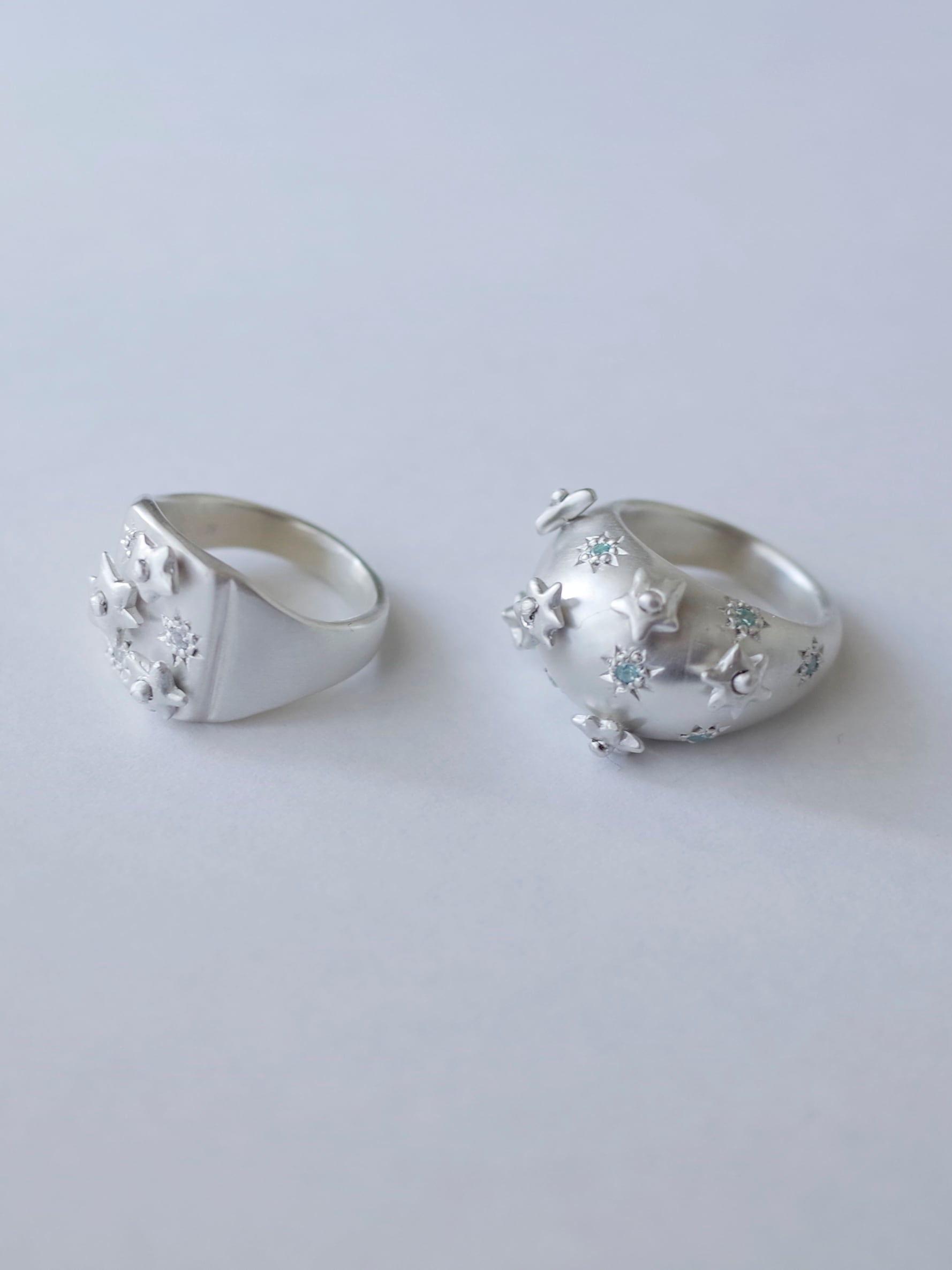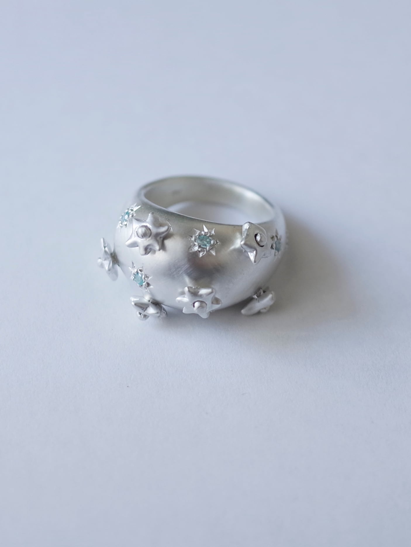 1.75mmのジルコニアをくるくる回る星の周囲に散りばめている指輪になります。