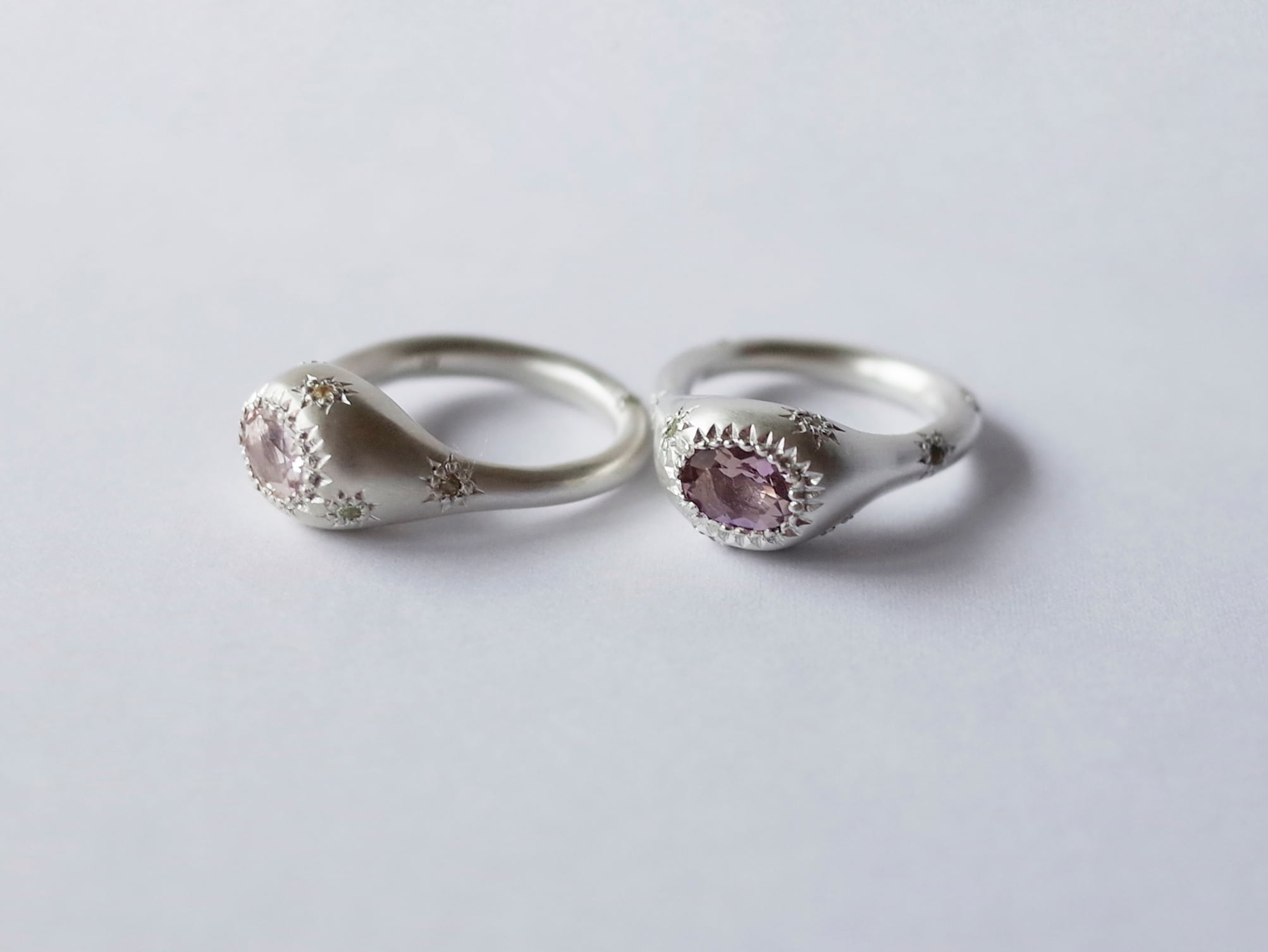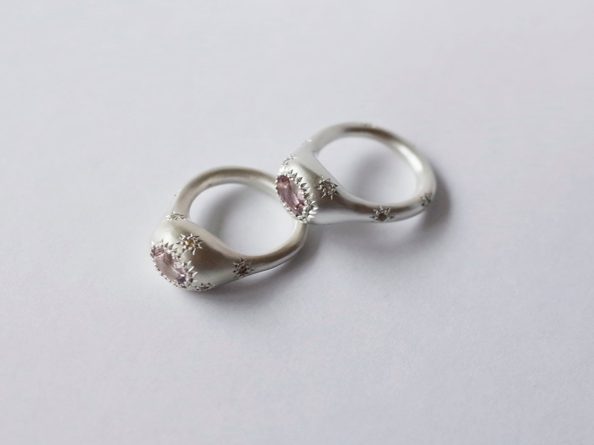 指輪トップに天然石を留めているのが特徴のSkábma Ringは北部サーミ語で"極夜""太陽の出ない季節"という意味のSkábmaから名づけています。中心の石を少し大きめの星、周りの細かな石を小さな星に見立て、夜空を見上げているイメージの指輪です。手に収まる小さな宇宙のような指輪です。